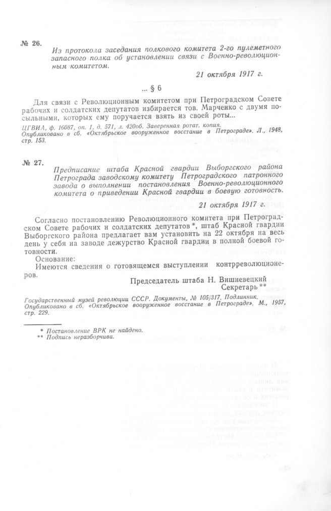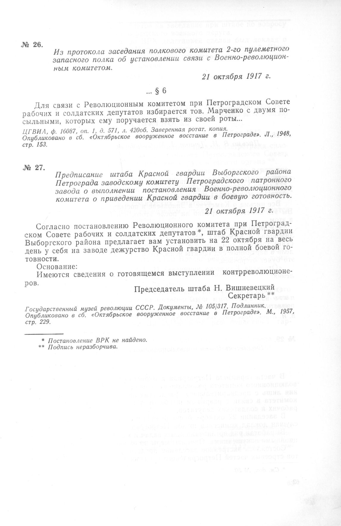 Предписание штаба Красной гвардии Выборгского района Петрограда заводскому комитету Петроградского патронного завода о выполнении постановления Военно-революционного комитета о приведении Красной гвардии в боевую готовность. 21 октября 1917 г. // Государственный музей революции СССР. Документы, № 1051317. Подлинник. Опубликовано в сб. «Октябрьское вооруженное восстание в Петрограде». М., 1957, стр. 229.