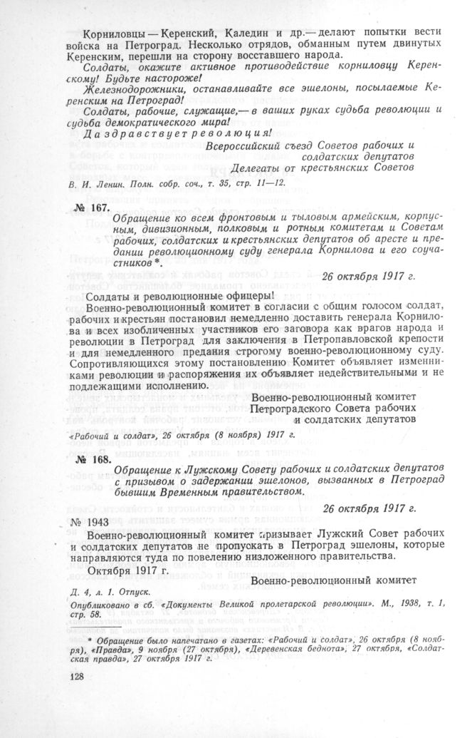 Обращение к Лужскому Совету рабочих и солдатских депутатов с призывом о задержании эшелонов, вызванных в Петроград бывшим Временным правительством. 26 октября 1917 г. // Д. 4, л. 1. Отпуск. Опубликовано в сб. «Документы Великой пролетарской революции». М., 1938, т. 1, стр. 58.