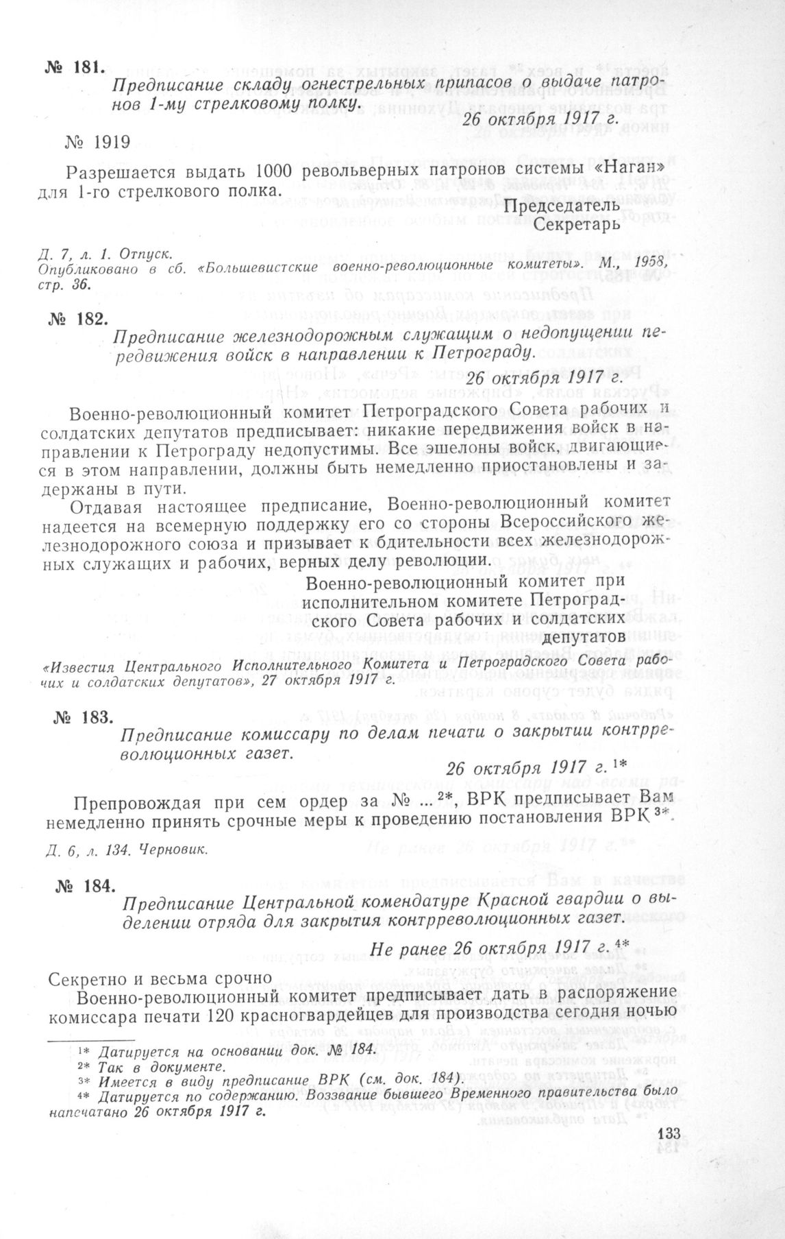 Предписание Центральной комендатуре Красной гвардии о выделении отряда для закрытия контрреволюционных газет. Не ранее 26 октября 1917 г. // Д. 6, л. 134. Черновик, д. 29, л. 83. Отпуск. Опубликовано в сб. «Документы Великой пролетарской революции». М., 1938, т. 1, стр. 57.