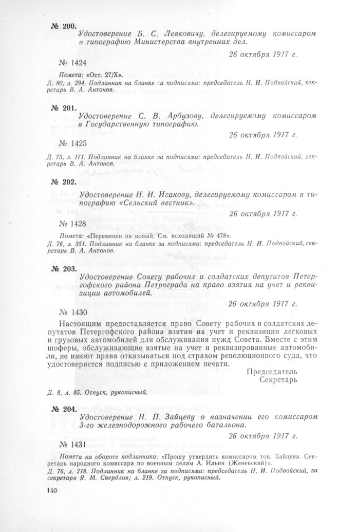 Удостоверение Совету рабочих и солдатских депутатов Петергофского района Петрограда на право взятия на учет и реквизиции автомобилей. 26 октября 1917 г. // Д. 8, л. 85. Отпуск, рукописный.