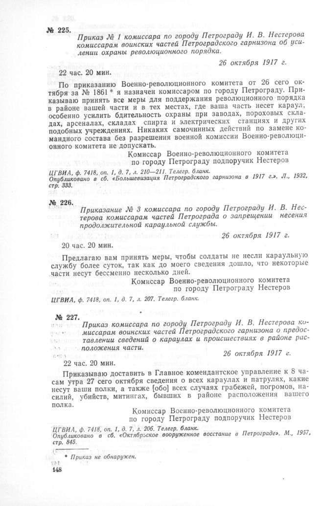 Приказ № 1 комиссара по городу Петрограду И.В. Нестерова комиссарам воинских частей Петроградского гарнизона об усилении охраны революционного порядка. 26 октября 1917 г. // ЦГВИА, ф. 7418, оп. 1, д. 7, л. 210—211. Телегр. бланк. Опубликовано в сб. «Большевизация Петроградского гарнизона в 1917 г.». Л., 1932, стр: 333.
