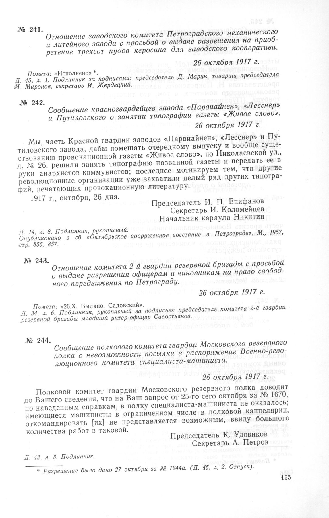 Петроградский военно-революционный комитет: Док. и материалы в 3 т. Т. 1. — М.: Наука, 1966.