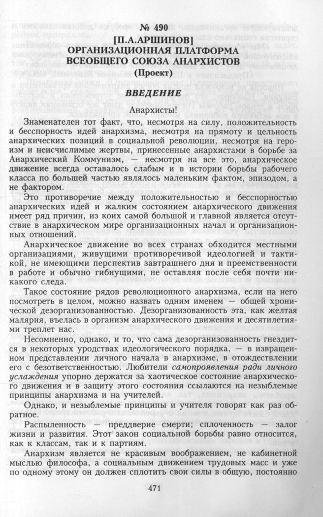 Главная Серия «Политические партии России. Конец XIX – первая треть ХХ века... Анархисты. Документы и материалы. 1883—1935 гг. В 2 тт. Анархисты. Документы и материалы. 1883—1935 гг. В 2 тт. Т. 2. 1917—... Документы Организационная платформа всеобщего союза анархистов (Проект)