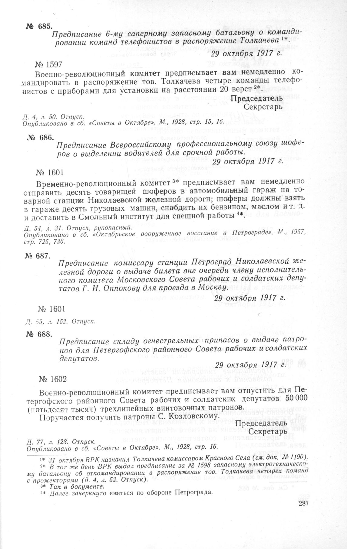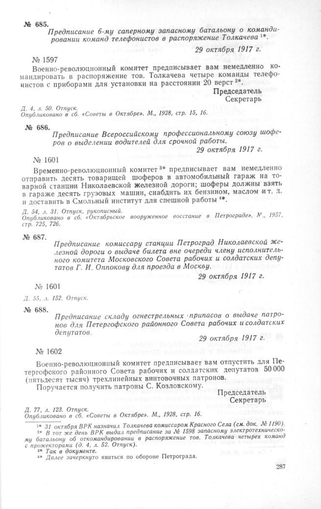 Предписание Всероссийскому профессиональному союзу шоферов о выделении водителей для срочной работы. 29 октября 1917 г. // Д. 54, л. 31. Отпуск, рукописный. Опубликовано в сб. «Октябрьское вооруженное восстание в Петрограде». №., 1957, стр. 725, 726.