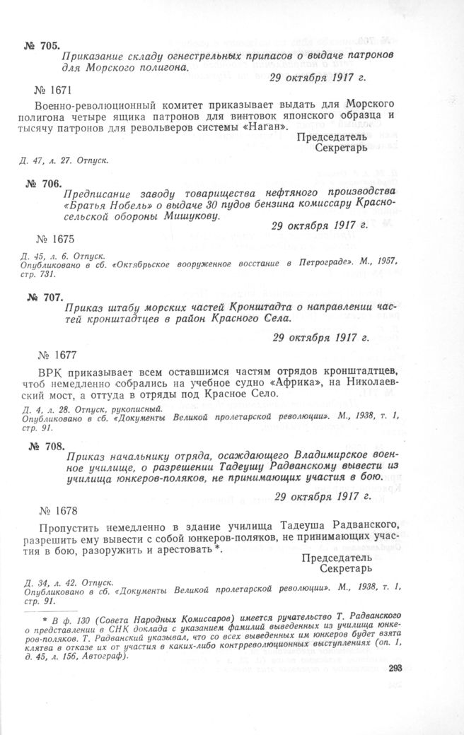 Приказ штабу морских частей Кронштадта о направлении частей кронштадтцев в район Красного Села. 29 октября 1917 г. // Д. 4, л. 28. Отпуск, рукописный. Опубликовано в сб. «Документы Великой пролетарской революции». М., 1938, т. 1, стр. 91.