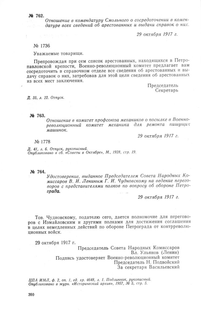 Удостоверение, выданное Председателем Совета Народных Комиссаров В.И. Лениным Г.И. Чудновскому на ведение переговоров с представителями полков по вопросу об обороне Петрограда. 29 октября 1917 г. // ЦПА ИМЛ, ф. 2, оп. 1, ед. хр. 4648, л. 1. Подлинник, рукописный. Опубликовано в журн. «Исторический архив», 1957, № 5, стр. 5.