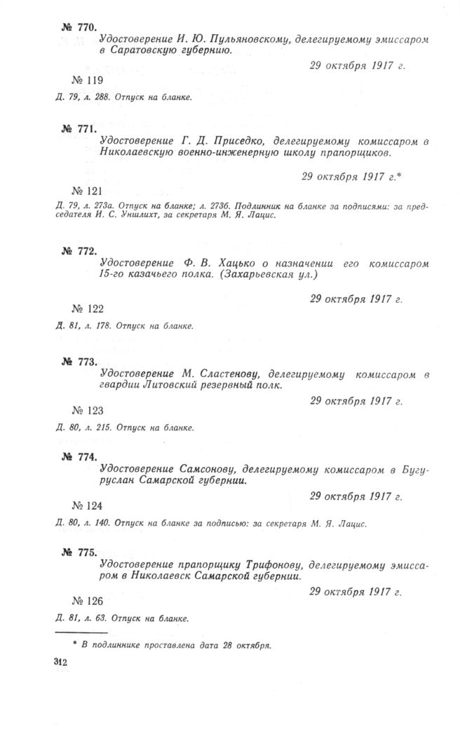 Удостоверение Г.Д. Приседко, делегируемому комиссаром в Николаевскую военно-инженерную школу прапорщиков. 29 октября 1917 г. // Д. 79, л. 273а. Отпуск на бланке; л. 2736. Подлинник на бланке.