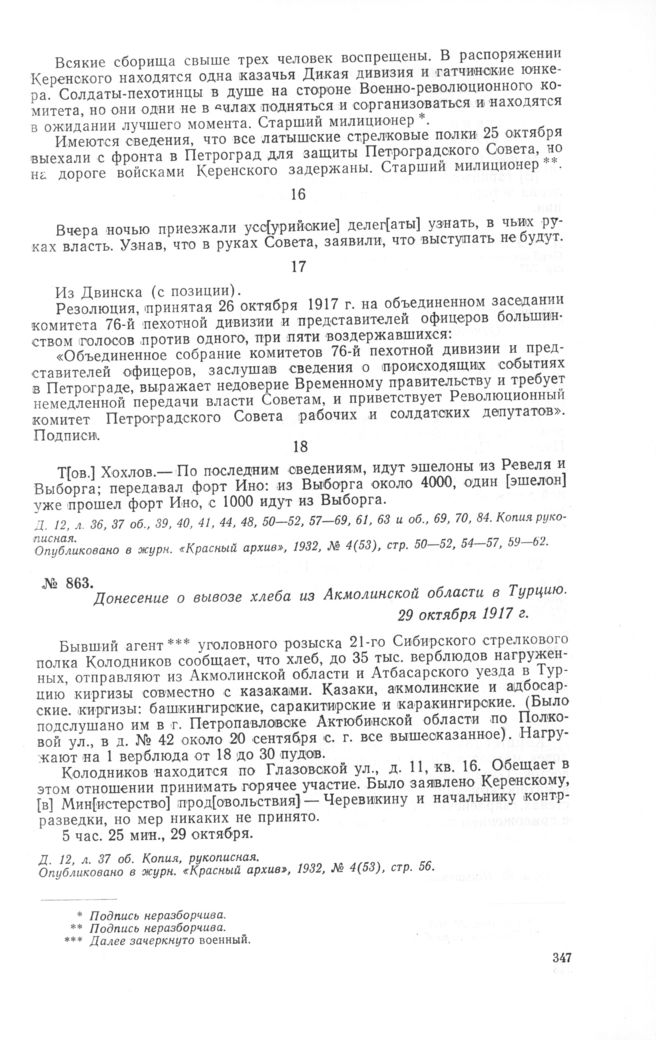 Донесение о вывозе хлеба из Акмолинской области в Турцию. 29 октября 1917 г. // Д. 12, л. 37 об. Копия, рукописная. Опубликовано в журн. «Красный архив», 1932, № 4(53), стр. 56.