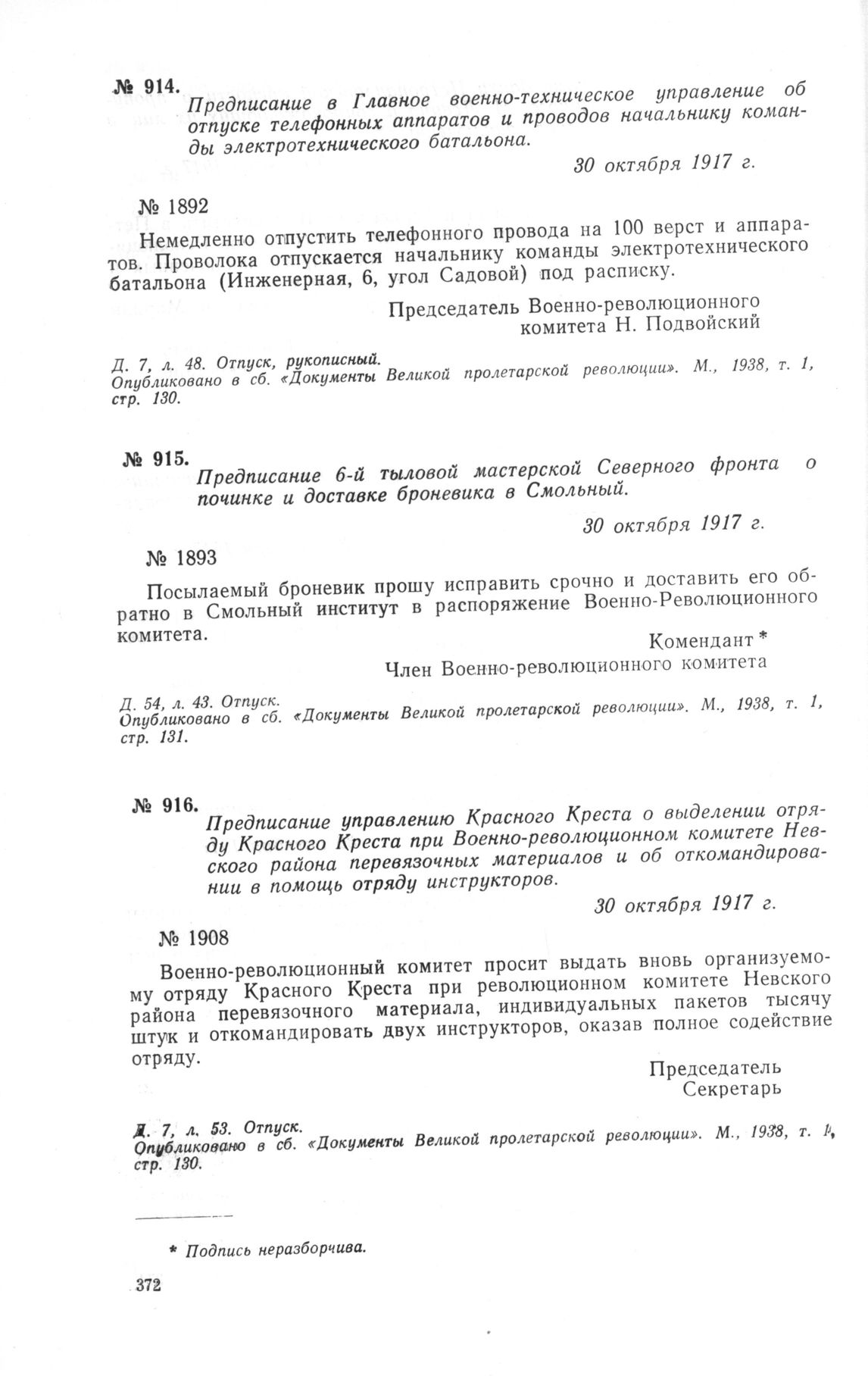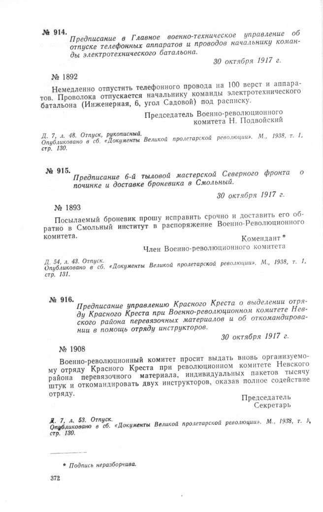 Предписание 6-й тыловой мастерской Северного фронта о починке и доставке броневика в Смольный. 30 октября 1917 г. // Д. 54, л. 43. Отпуск. Опубликовано в сб. «Документы Великой пролетарской революции». М., 1938, т. 1, стр. 131.