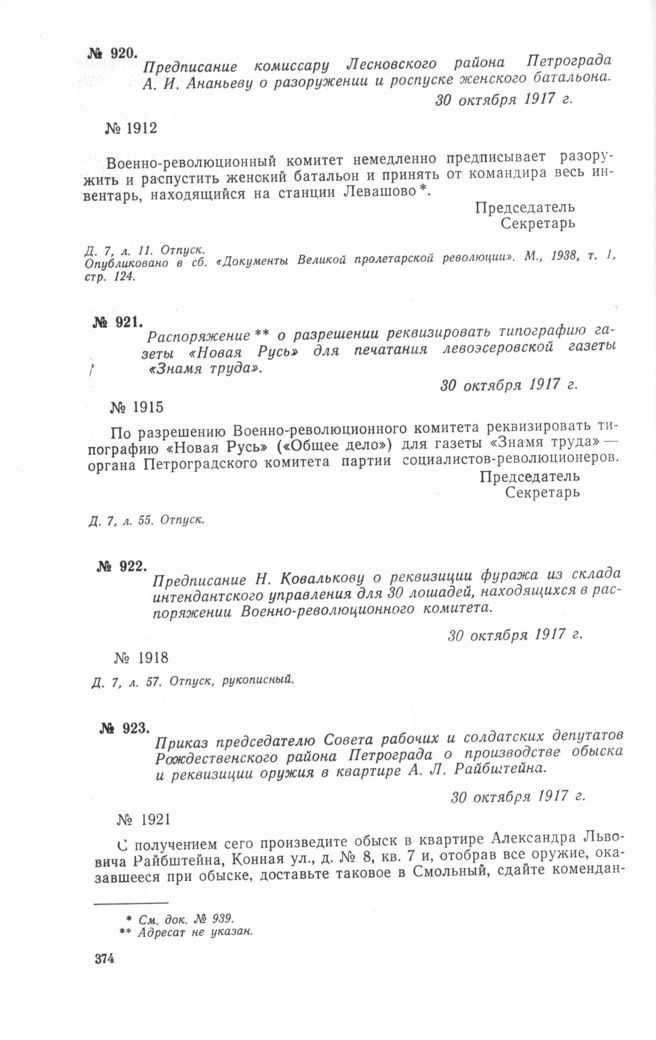 Предписание Н. Ковалькову о реквизиции фуража из склада интендантского управления для 30 лошадей, находящихся в распоряжении Военно-революционного комитета. 30 октября 1917 г. // Д. 7, л. 57. Отпуск, рукописный.