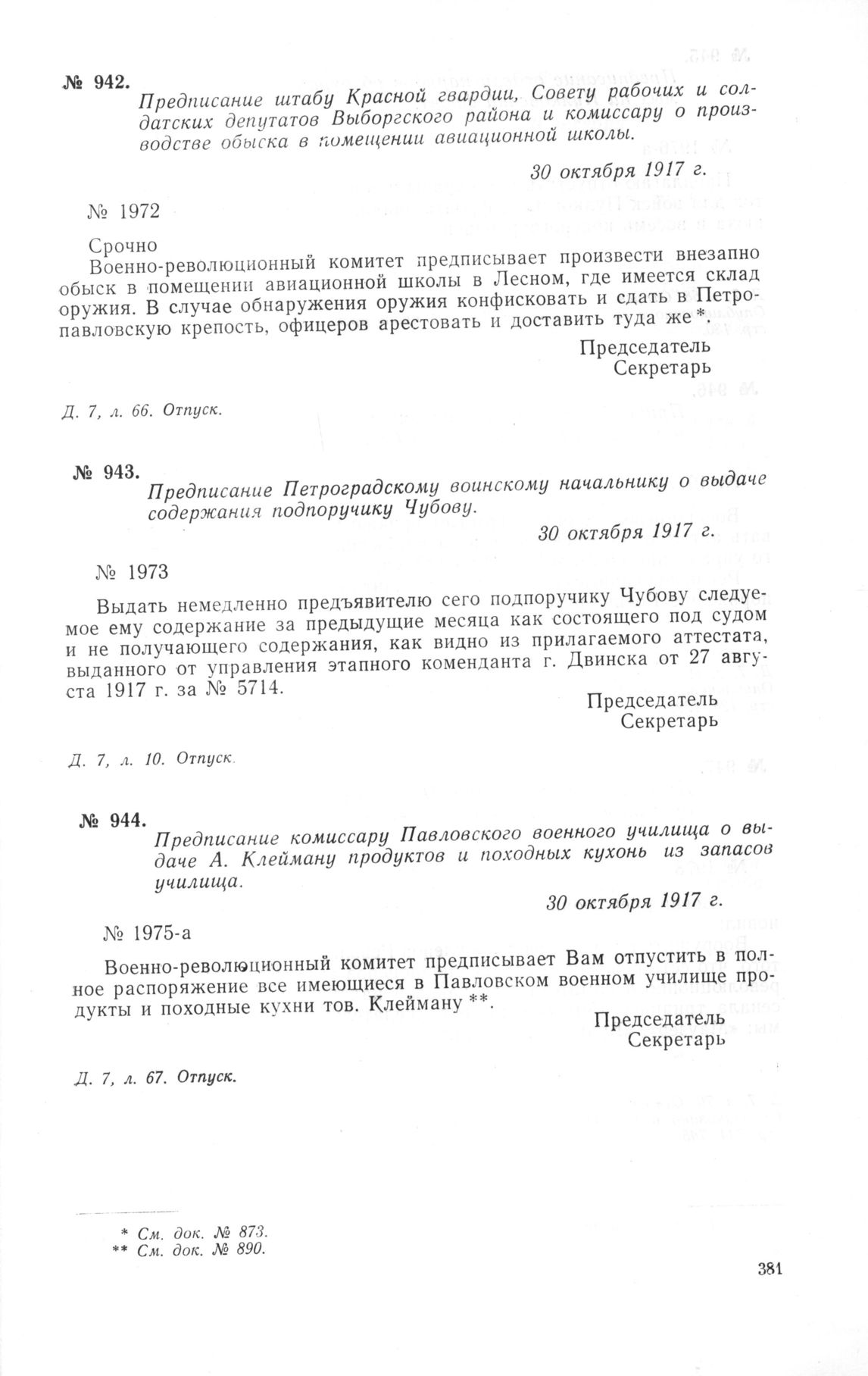 Предписание штабу Красной гвардии, Совету рабочих и солдатских депутатов Выборгского района и комиссару о производстве обыска в помещении авиационной школы. 30 октября 1917 г. // Д. 7, л. 66. Отпуск.