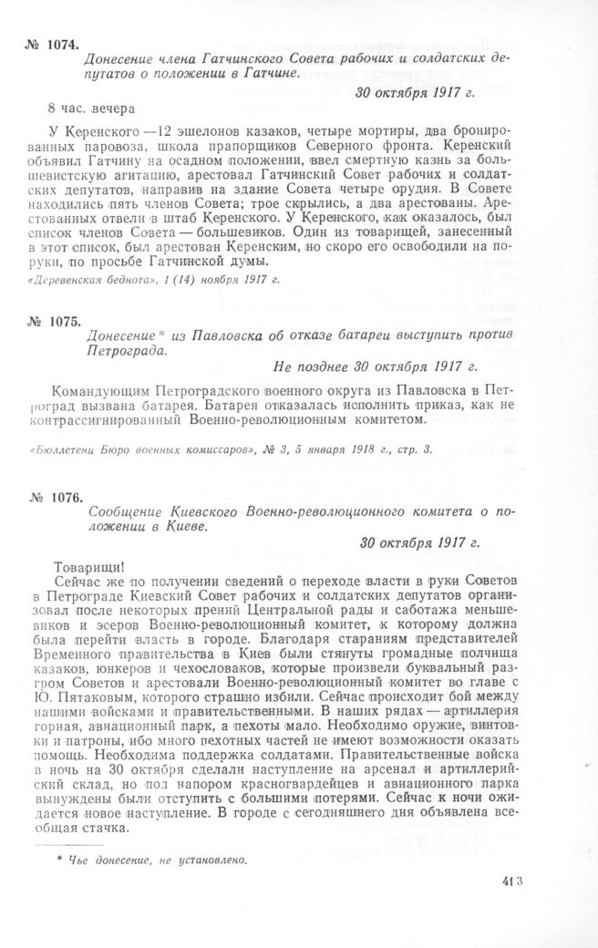 Донесение из Павловска об отказе батареи выступить против Петрограда. Не позднее 30 октября 1917 г. // «Бюллетени Бюро военных комиссаров», №3, 5 января 1918 г., стр. 3.