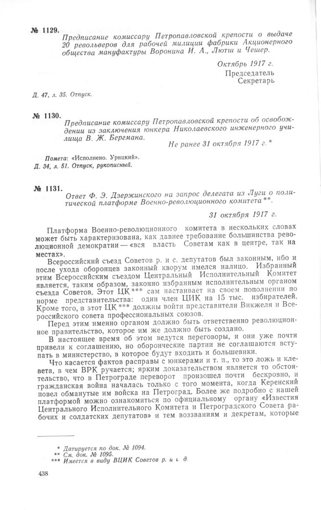 Ответ Ф.Э. Дзержинского на запрос делегата из Луги о политической платформе Военно-революционного комитета. 31 октября 1917 г. // Д. 3, л. 13. Отпуск. Опубликовано в сб. «Документы Великой пролетарской революции». М., 1938, т. 1, стр. 140, 141.