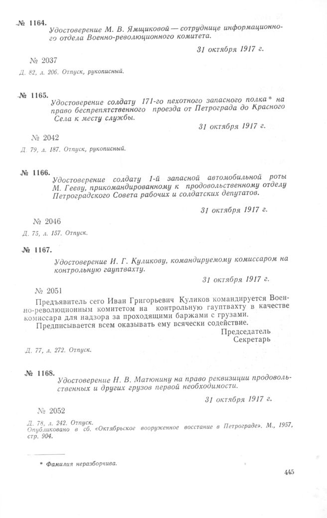 Удостоверение солдату 1-й запасной автомобильной роты М. Гееву, прикомандированному к продовольственному отделу Петроградского Совета рабочих и солдатских депутатов. 31 октября 1917 г. // Д. 75, л. 157. Отпуск.