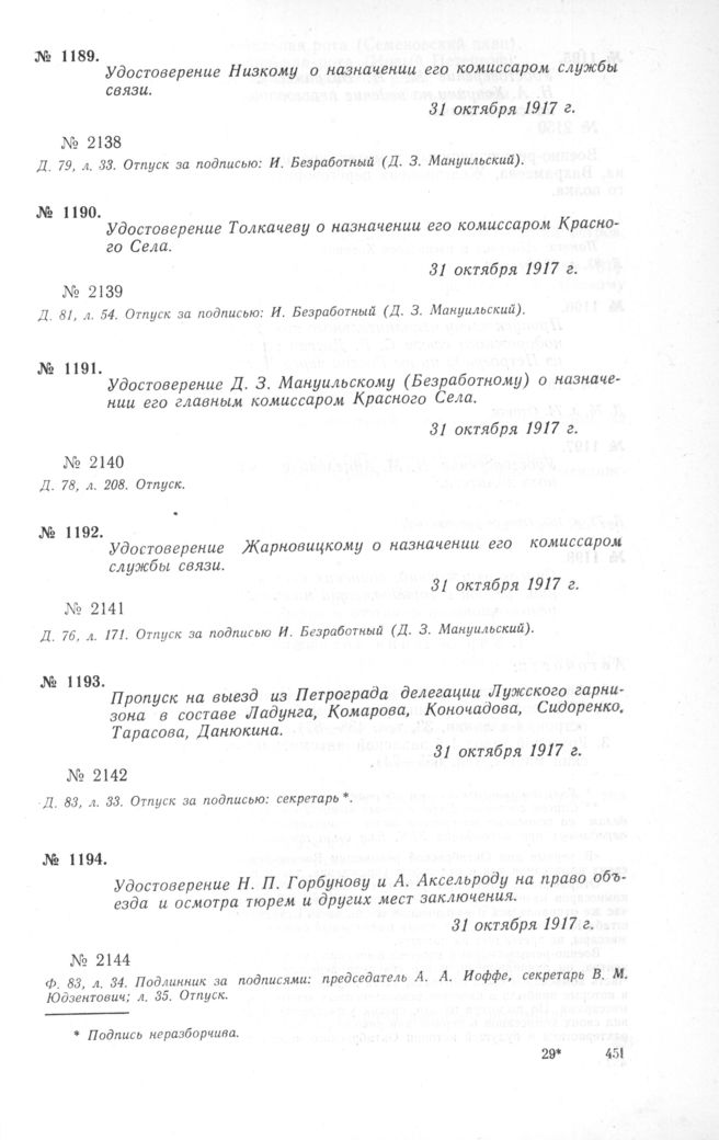 Удостоверение Д.3. Мануильскому (Безработному) о назначении его главным комиссаром Красного Села. 31 октября 1917 г. // Д. 78, л. 208. Отпуск.