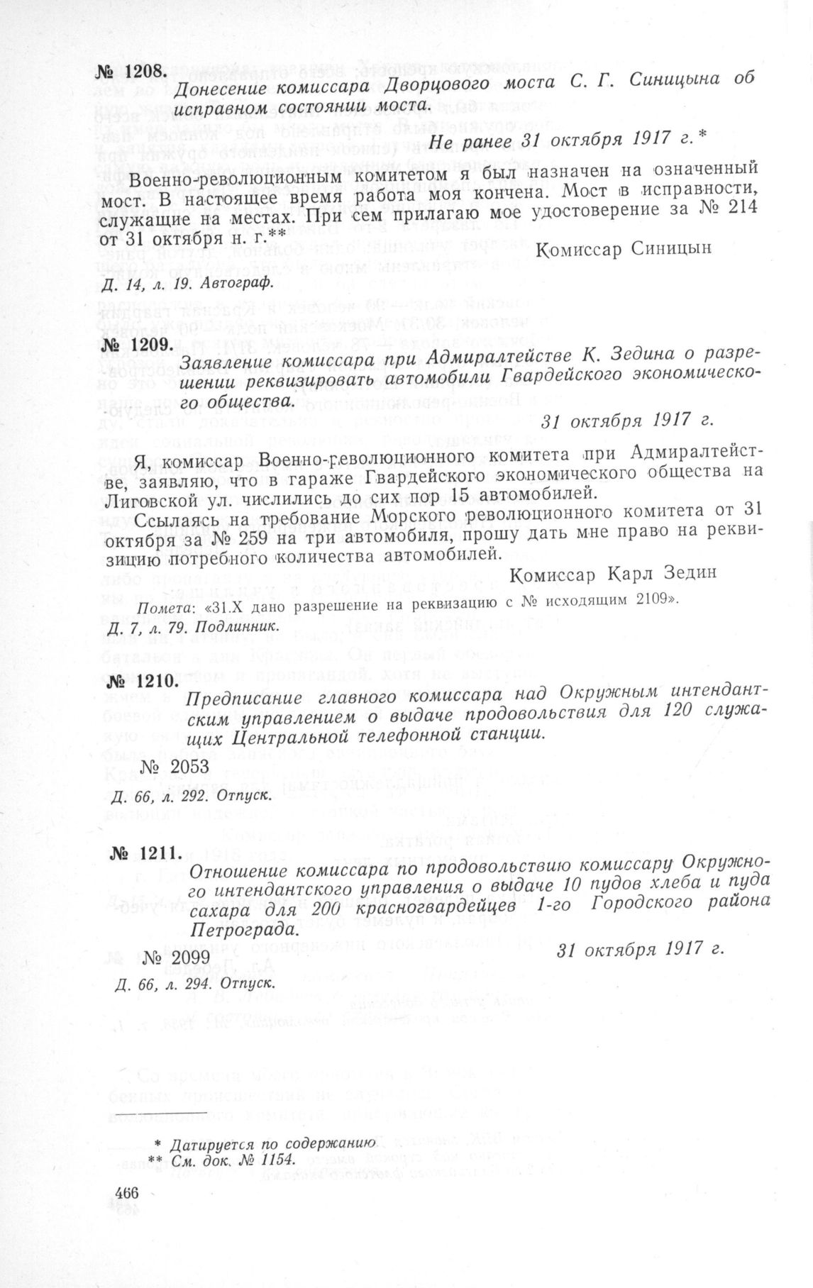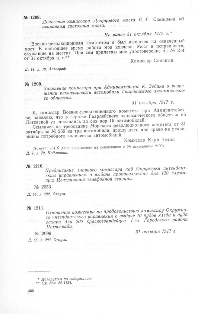 Заявление комиссара при Адмиралтействе К. Зедина о разрешении реквизировать автомобили Гвардейского экономического общества. 31 октября 1917 г. // Д. 7, л. 79. Подлинник.