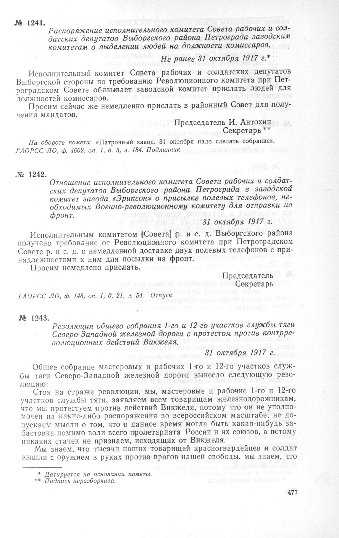 Резолюция общего собрания 1-го и 12-го участков службы тяги Северо-Западной железной дороги с протестом против контрреволюционных действий Викжеля. 31 октября 1917 г.