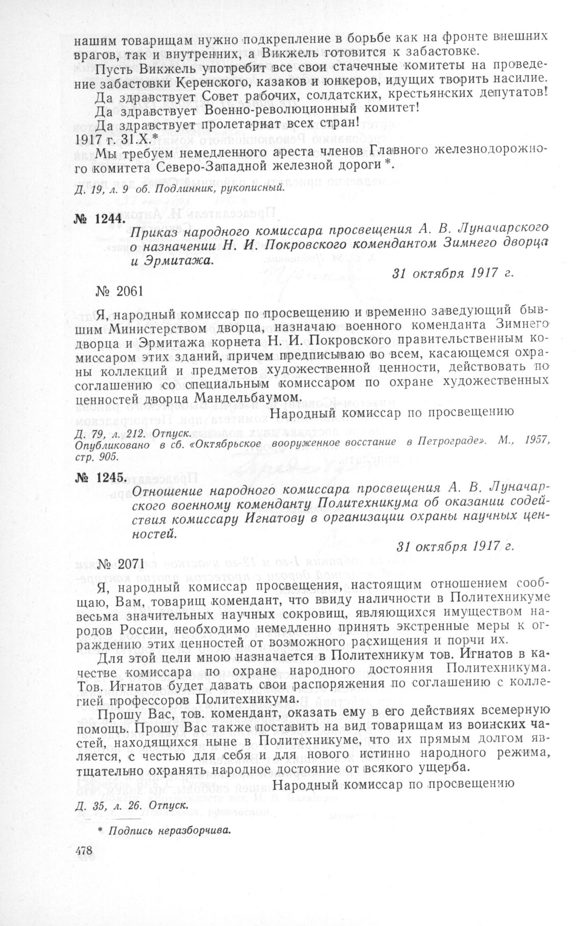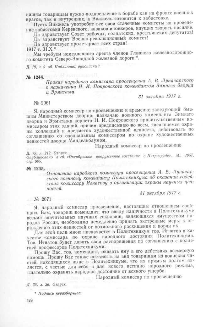 Отношение народного комиссара просвещения А.В. Луначарского военному коменданту Политехникума об оказании содействия комиссару Игнатову в организации охраны научных ценностей. 31 октября 1917 г. // Д. 35, л. 26. Отпуск.