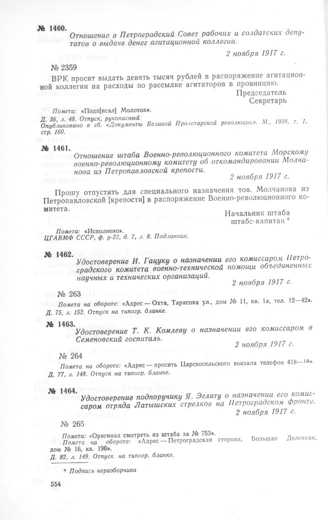 Отношение в Петроградский Совет рабочих и солдатских депутатов о выдаче денег агитационной коллегии. 2 ноября 1917 г. // Д. 36, л. 48. Отпуск, рукописный. Опубликовано в сб. «Документы Великой Пролетарской революции». М., 1938, т. 1, стр. 160.