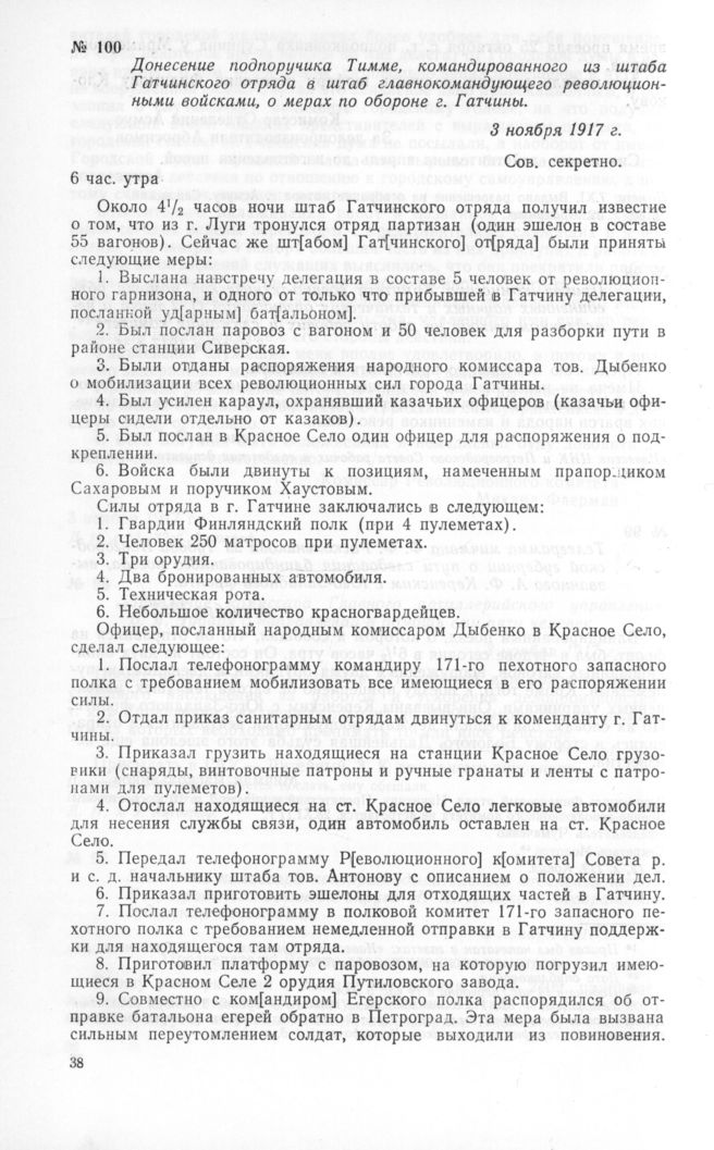 Донесение подпоручика Тимме, командированного из штаба Гатчинского отряда в штаб главнокомандующего революционными войсками, о мерах по обороне г. Гатчины. 3 ноября 1917 г. // Д. 12, л. 112—112об. Отпуск. Опубликовано в сб. «Документы Великой пролетарской революции». М., 1938, т. I, стр. 169—170.