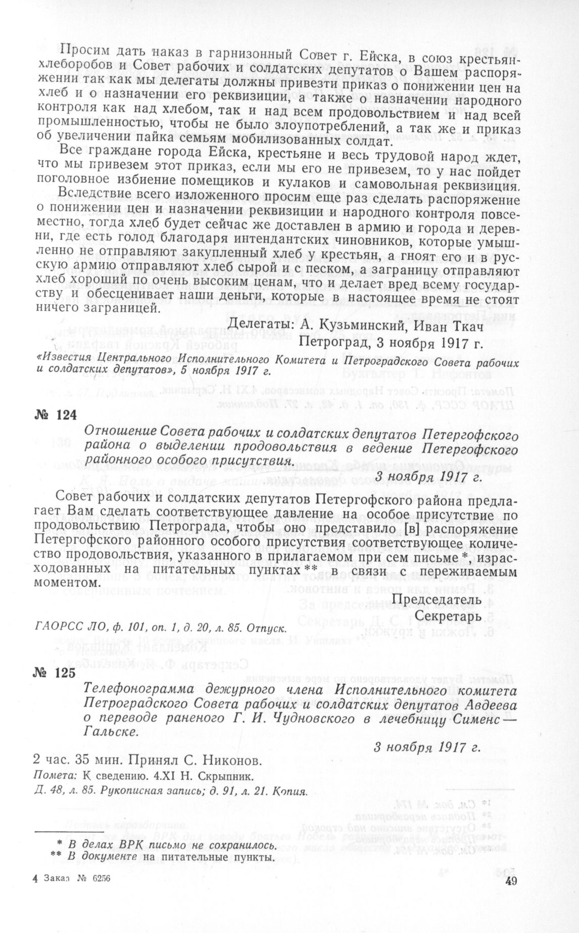 Отношение Совета рабочих и солдатских депутатов Петергофского района о выделении продовольствия в ведение Петергофского районного особого присутствия. 3 ноября 1917 г. // ГАОРСС ЛО, ф. 101, оп. 1, д. 20, л. 85. Отпуск.