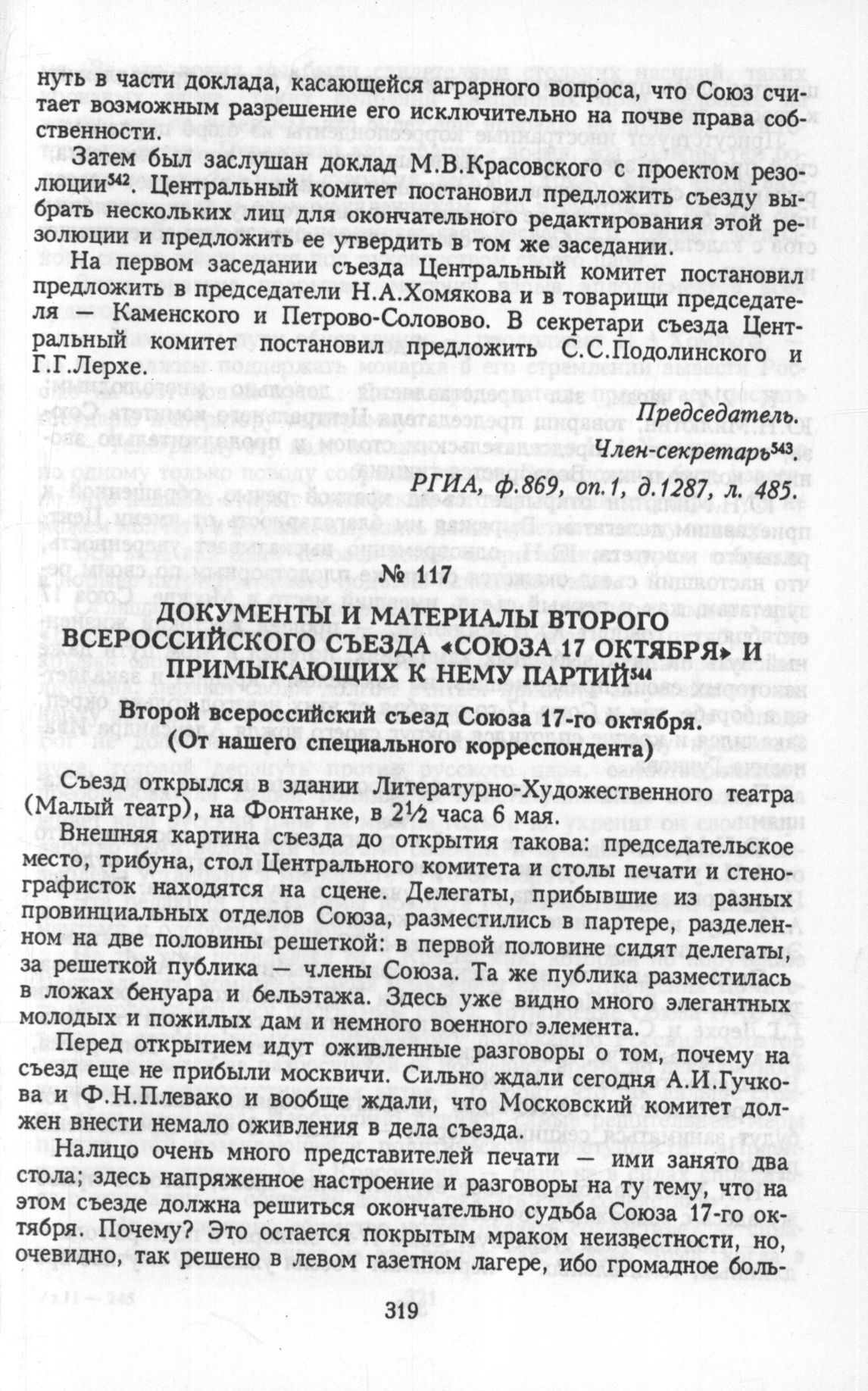 Документы и материалы второго всероссийского съезда «Союза 17 октября» и примыкающих к нему партий. Первый день