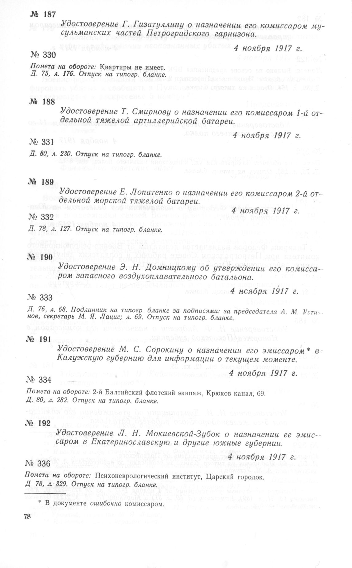 Удостоверение Т. Смирнову о назначении его комиссаром 1-й отдельной тяжелой артиллерийской батареи. 4 ноября 1917 г. // Д. 80, л. 230. Отпуск на типогр. бланке.