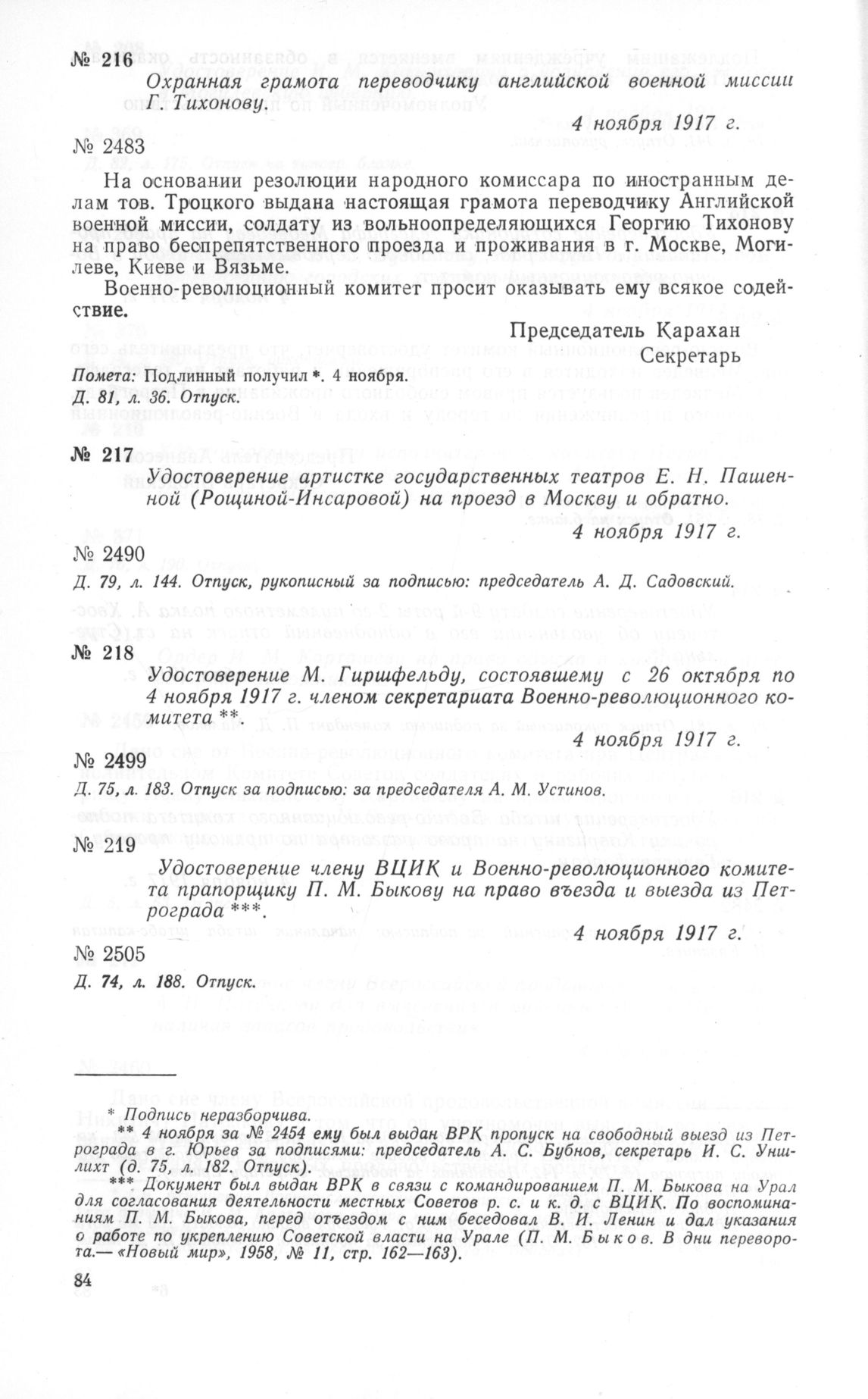 Удостоверение члену ВЦИК и Военно-революционного комитета прапорщику П. М. Быкову на право въезда и выезда из Петрограда. 4 ноября 1917 г. // Д. 74, л. 188. Отпуск.