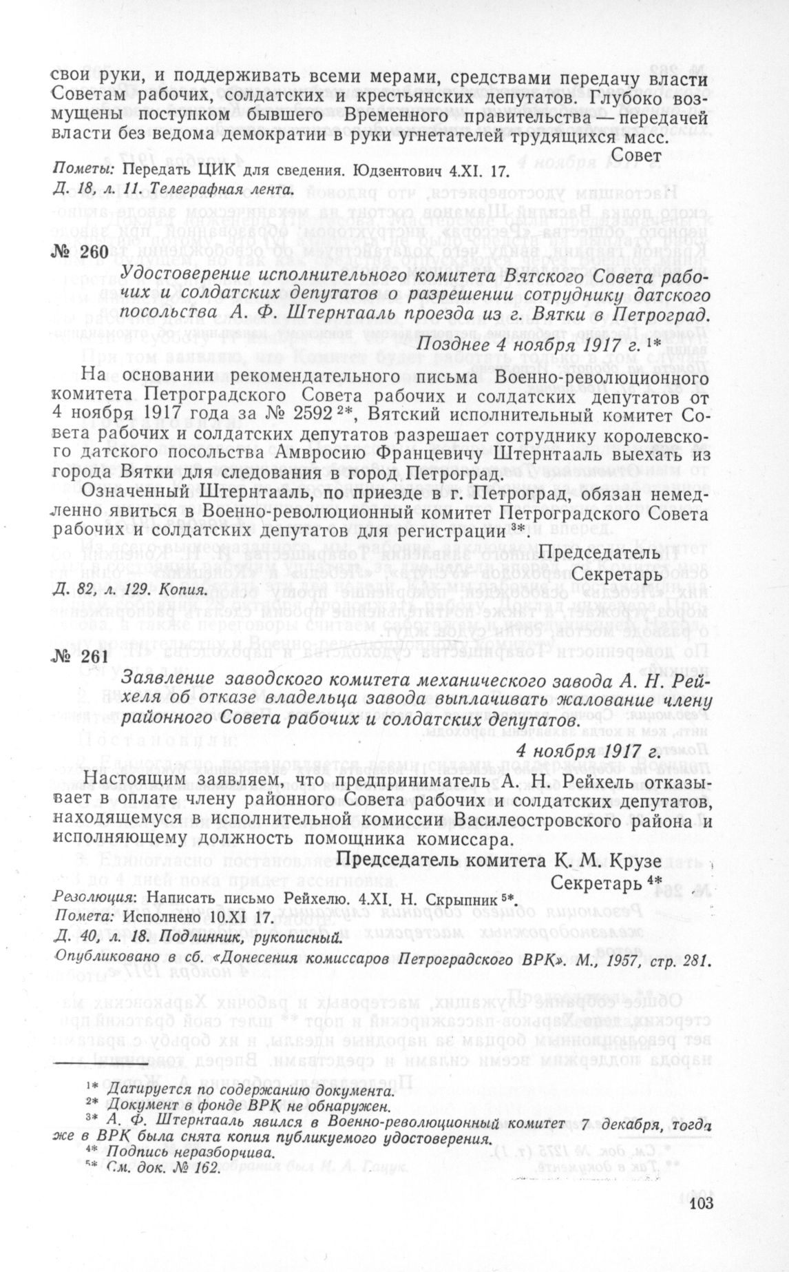 Заявление заводского комитета механического завода А. Н. Рейхеля об отказе владельца завода выплачивать жалование члену районного Совета рабочих и солдатских депутатов. 4 ноября 1917 г. // Д. 40, л. 18. Подлинник, рукописный. Опубликовано в сб. «Донесения комиссаров Петроградского ВРК». М., 1957, стр. 281.