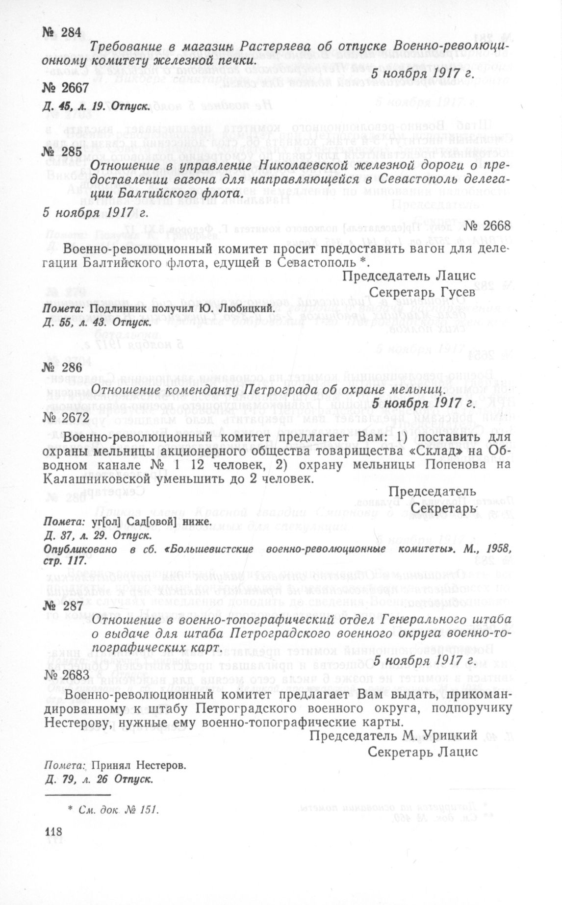 Отношение коменданту Петрограда об охране мельниц. 5 ноября 1917 г. // Д. 37, л. 29. Отпуск. Опубликовано в сб. «Большевистские военно-революционные комитеты». М., 1958, стр. 117.