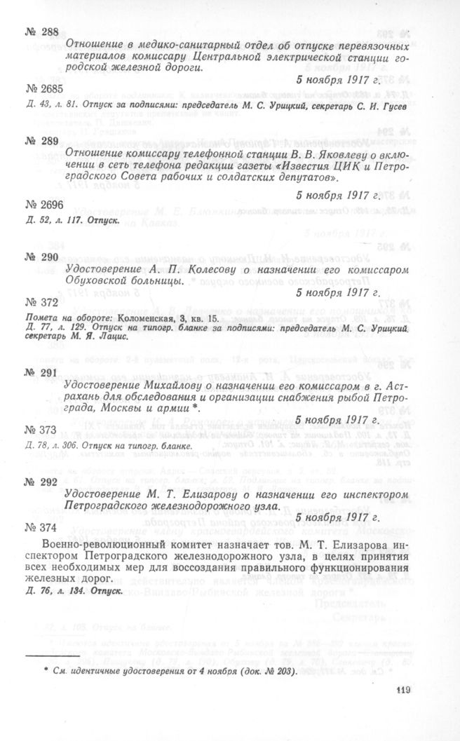 Удостоверение М. Т. Елизарову о назначении его инспектором Петроградского железнодорожного узла. 5 ноября 1917 г.