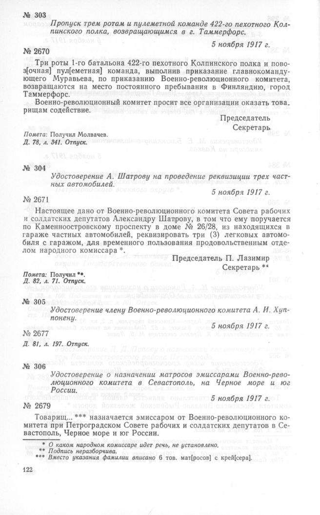 Удостоверение о назначении матросов эмиссарами Военно-революционного комитета в Севастополь, на Черное море и юг России. 5 ноября 1917 г. // Д. 83, л. 196. Отпуск.