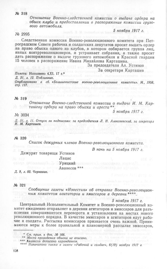 Отношение Военно-следственной комиссии о выдаче ордера на обыск клуба и предоставлении в распоряжение комиссии грузового автомобиля. 5 ноября 1917 г. // Д. 31, л. 12. Подлинник. Опубликовано в сб. «Большевистские военно-революционные комитеты». М., 1958, стр. 117.
