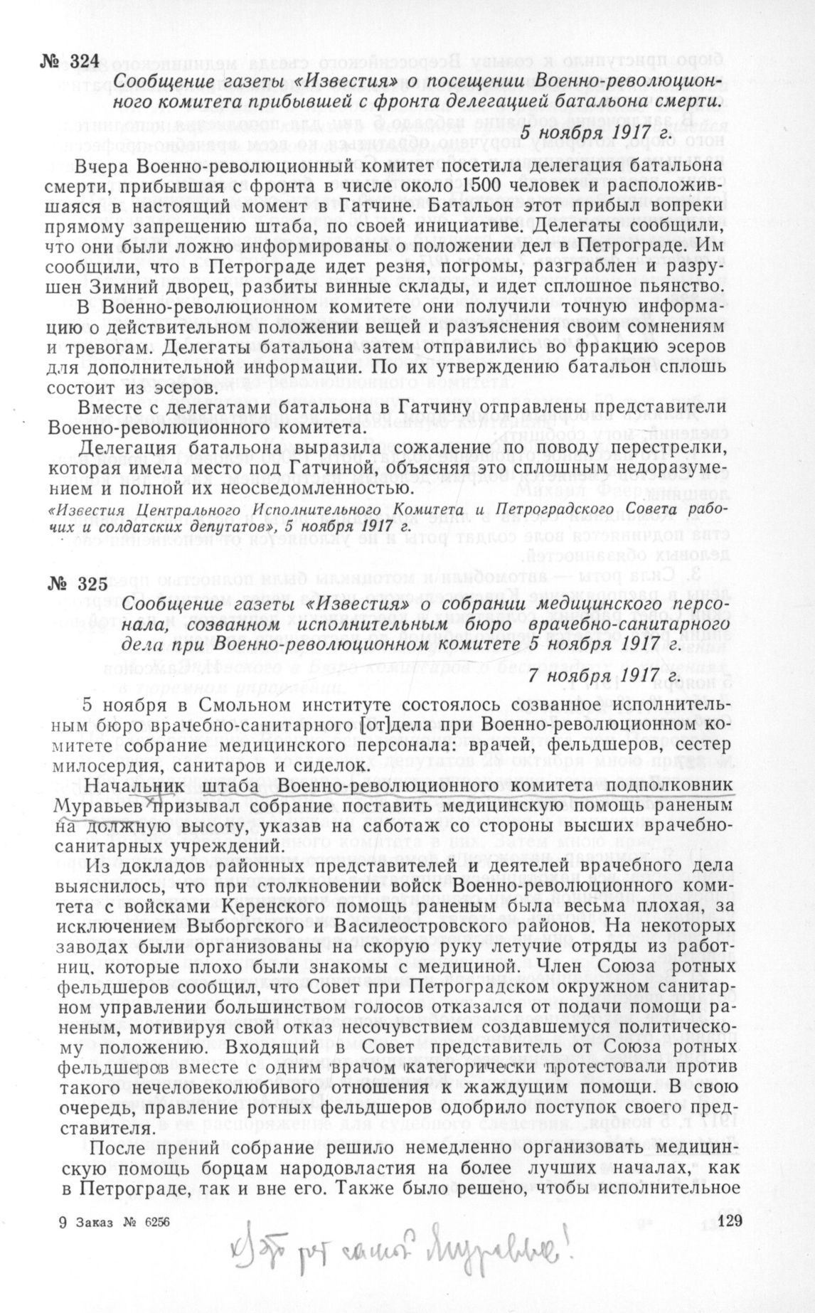 Сообщение газеты «Известия» о посещении Военно-революционного комитета прибывшей с фронта делегацией батальона смерти. 5 ноября 1917 г. // «Известия Центрального Исполнительного Комитета и Петроградского Совета рабочих и солдатских депутатов», 5 ноября 1917 г.
