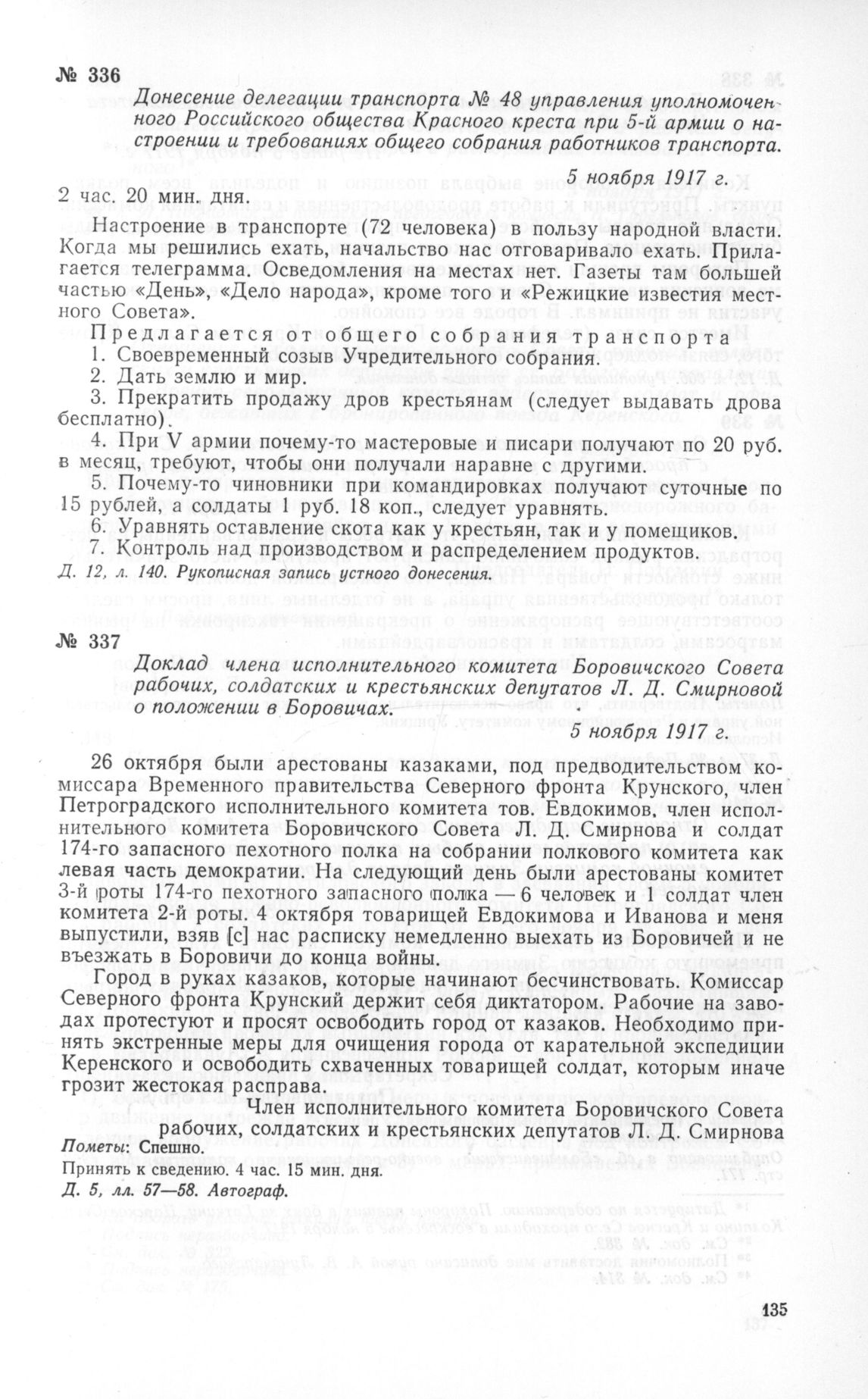 Доклад члена исполнительного комитета Боровичского Совета рабочих, солдатских и крестьянских депутатов Л. Д. Смирновой о положении в Боровичах. 5 ноября 1917 г. // Д. 5, лл. 57—58. Автограф.