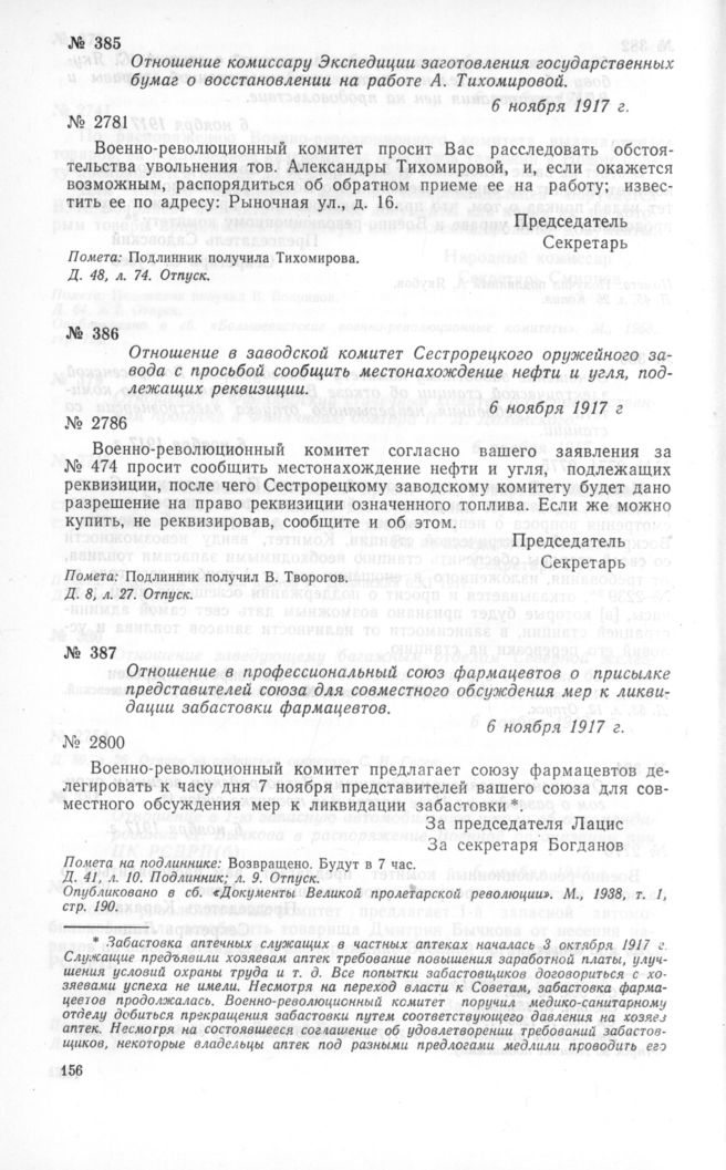 Отношение в профессиональный союз фармацевтов о присылке представителей союза для совместного обсуждения мер к ликвидации забастовки фармацевтов. 6 ноября 1917 г. // Д. 41, л. 10. Подлинник; л. 9. Отпуск. Опубликовано в сб. «Документы Великой пролетарской революции». М., 1938, т. 1, стр. 190.
