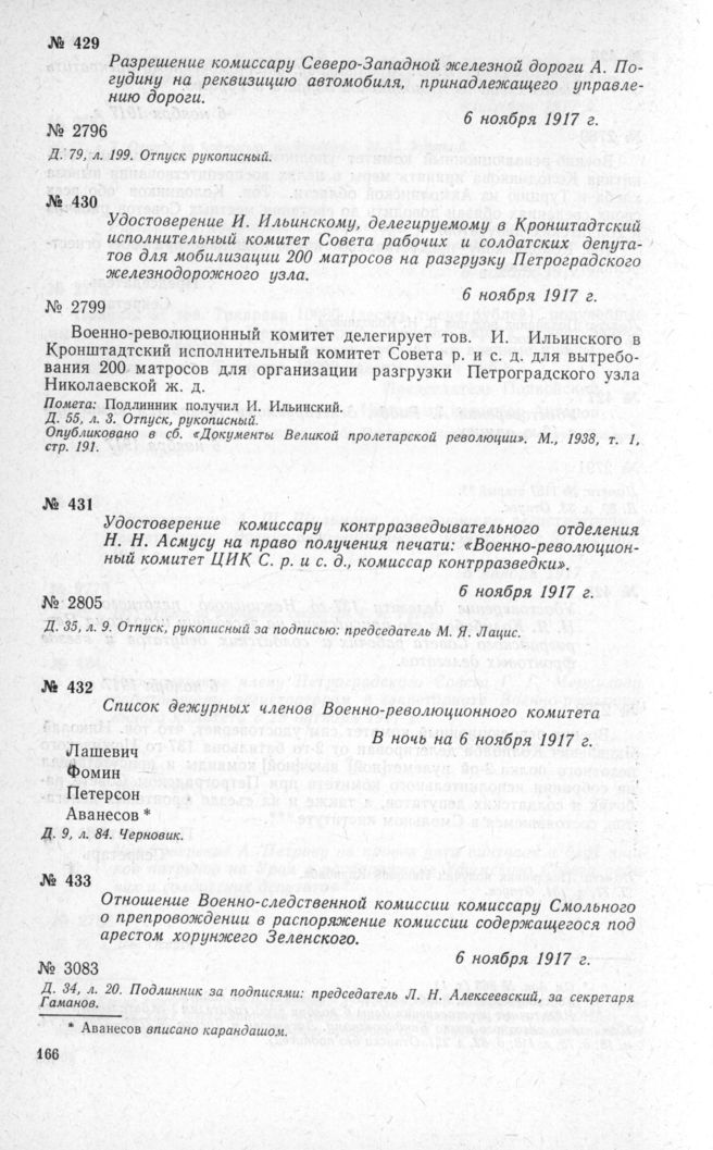 Отношение Военно-следственной комиссии комиссару Смольного о препровождении в распоряжение комиссии содержащегося под арестом хорунжего Зеленского. 6 ноября 1917 г. // Д. 34, л. 20. Подлинник за подписями: председатель Л. Н. Алексеевский, за секретаря Гаманов.