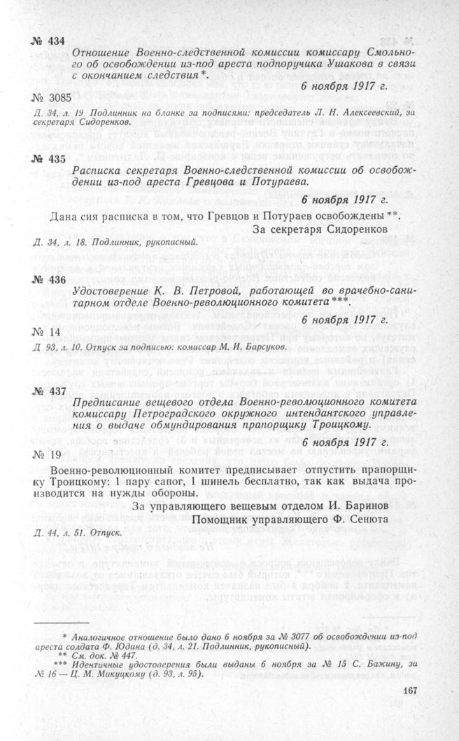 Отношение Военно-следственной комиссии комиссару Смольного об освобождении из-под ареста подпоручика Ушакова в связи с окончанием следствия. 6 ноября 1917 г. // Д. 34, л. 19 Подлинник на бланке за подписями: председатель Л. Н. Алексеевский, за секретаря Сидоренков.