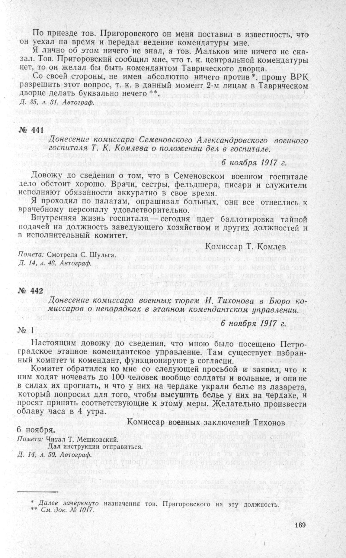 Донесение комиссара военных тюрем И. Тихонова в Бюро комиссаров о непорядках в этапном комендантском управлении. 6 ноября 1917 г.