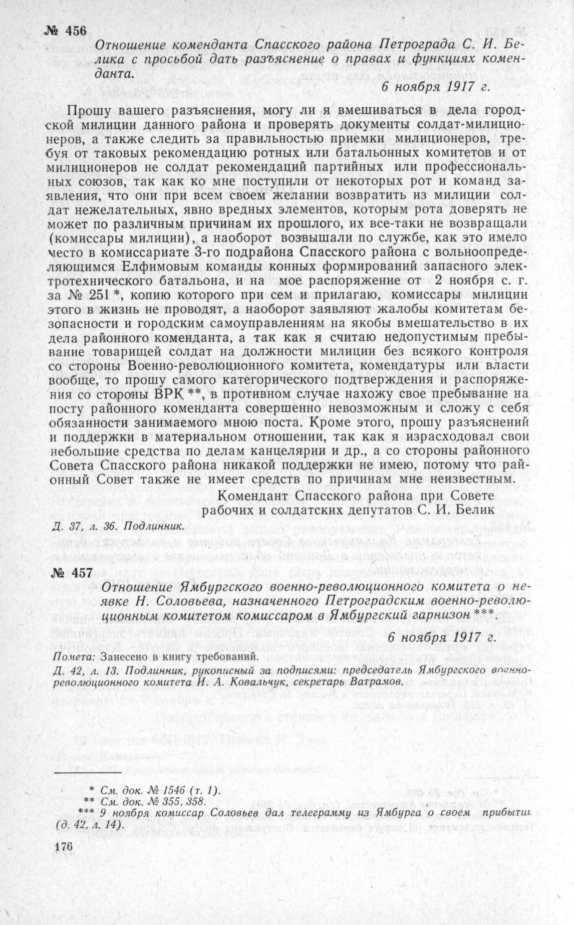 Отношение Ямбургского военно-революционного комитета о неявке Н. Соловьева, назначенного Петроградским военно-революционным комитетом комиссаром в Ямбургский гарнизон. 6 ноября 1917 г. // Д. 42, л. 13. Подлинник, рукописный за подписями: председатель Ямбургского военно-революционного комитета И. А. Ковальчук, секретарь Ватрамов.