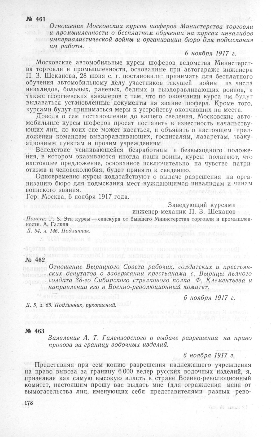 Отношение Московских курсов шоферов Министерства торговли и промышленности о бесплатном обучении на курсах инвалидов империалистической войны и организации бюро для подыскания им работы. 6 ноября 1917 г. // Д. 54, л. 146. Подлинник.