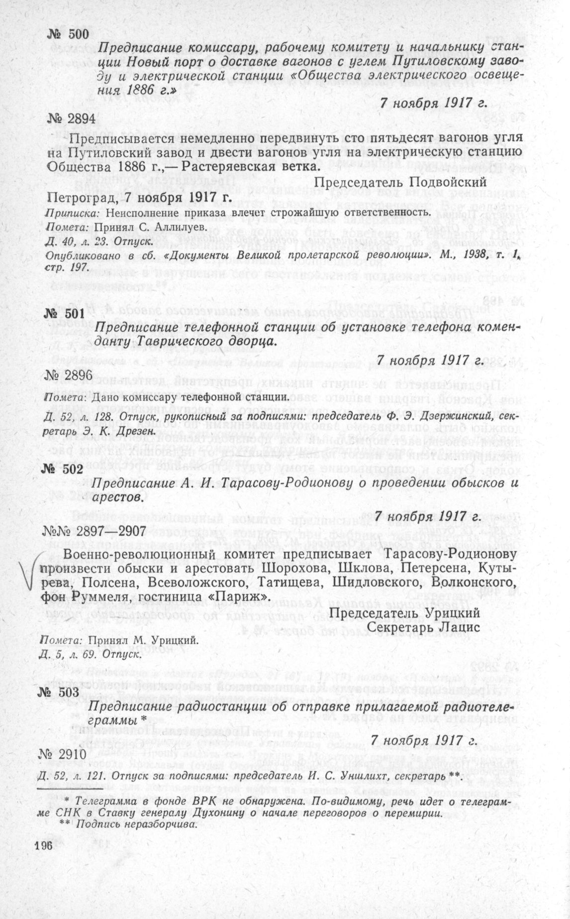 Предписание комиссару, рабочему комитету и начальнику станции Новый порт о доставке вагонов с углем Путиловскому заводу и электрической станции «Общества электрического освещения 1886 г.». 7 ноября 1917 г. // Д. 40, л. 23. Отпуск. Опубликовано в сб. «Документы Великой пролетарской революции». М., 1938, т. 1, стр. 197.