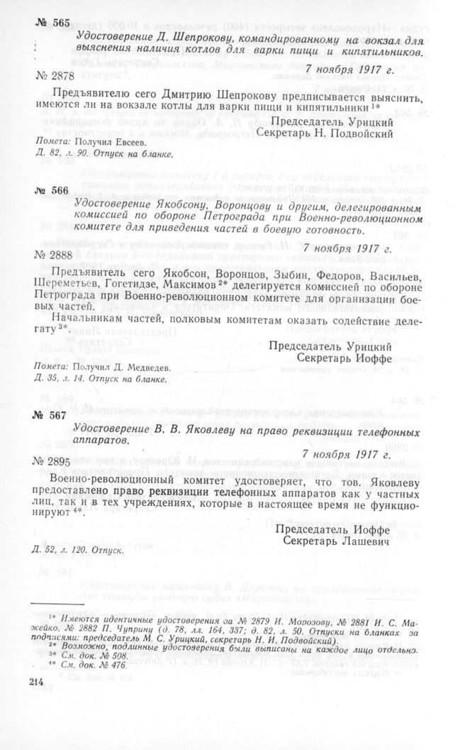 Удостоверение Якобсону, Воронцову и другим, делегированным комиссией по обороне Петрограда при Военно-революционном комитете для приведения частей в боевую готовность. 7 ноября 1917 г.