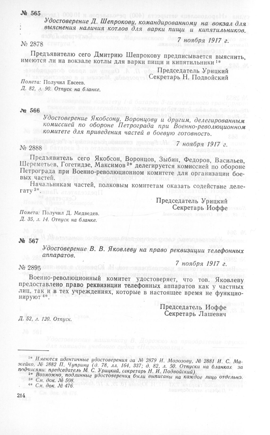 Удостоверение Якобсону, Воронцову и другим, делегированным комиссией по обороне Петрограда при Военно-революционном комитете для приведения частей в боевую готовность. 7 ноября 1917 г. // Д. 35, л. 14. Отпуск на бланке.