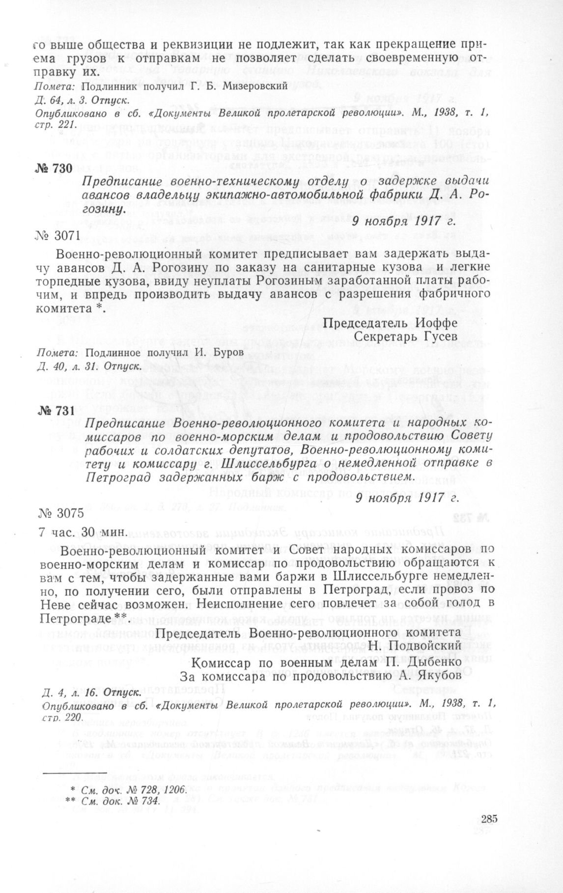Предписание Военно-революционного комитета и народных комиссаров по военно-морским делам и продовольствию Совету рабочих и солдатских депутатов, Военно-революционному комитету и комиссару г. Шлиссельбурга о немедленной отправке в Петроград задержанных барж с продовольствием. 9 ноября 1917 г. // Д. 4, л. 16. Отпуск. Опубликовано в сб. «Документы Великой пролетарской революции». М., 1938, т. 1, стр. 220.