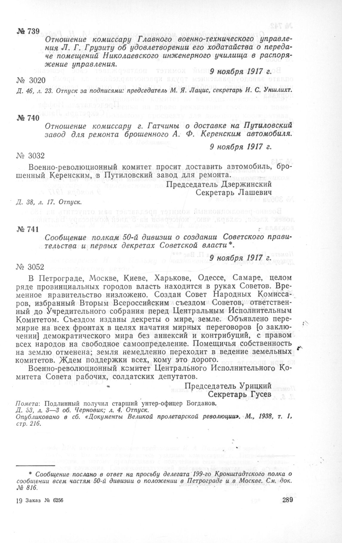 Отношение комиссару г. Гатчины о доставке на Путиловский завод для ремонта брошенного А. Ф. Керенским автомобиля. 9 ноября 1917 г. // Д. 38, л. 17. Отпуск.