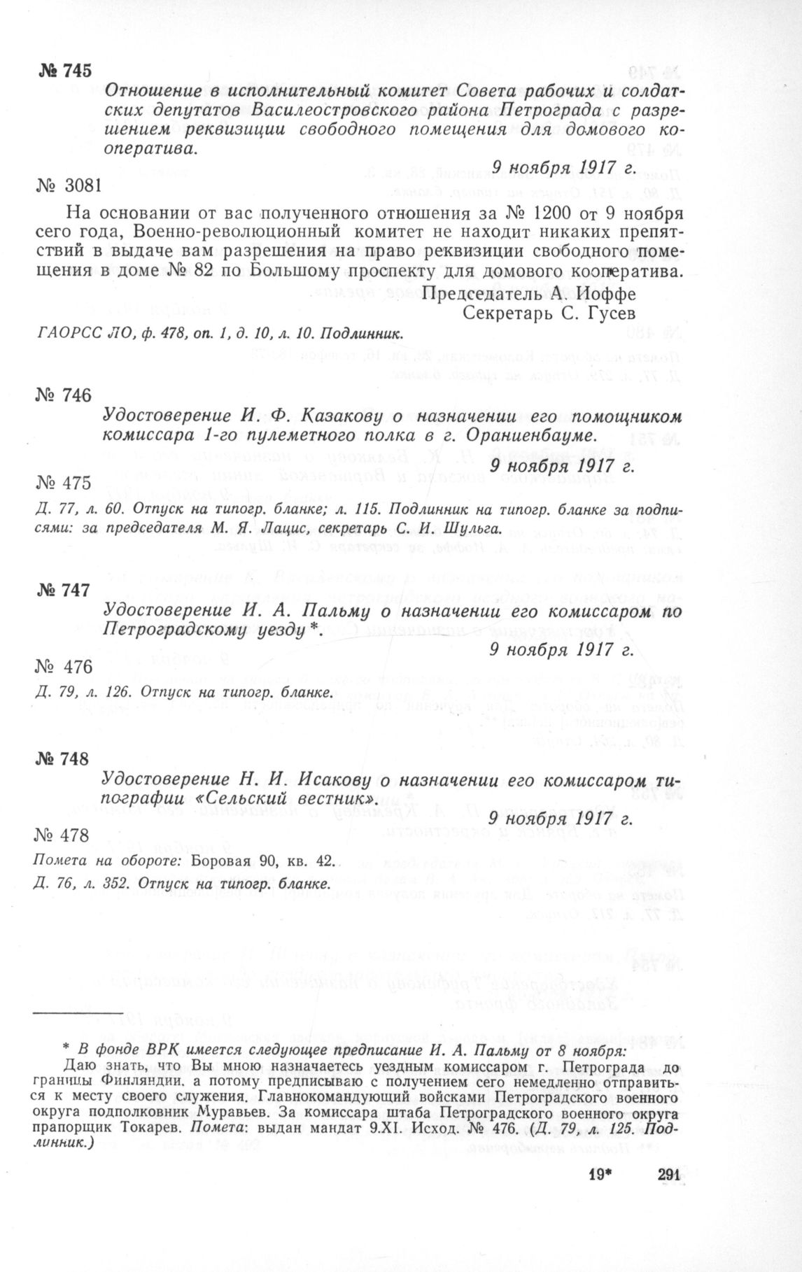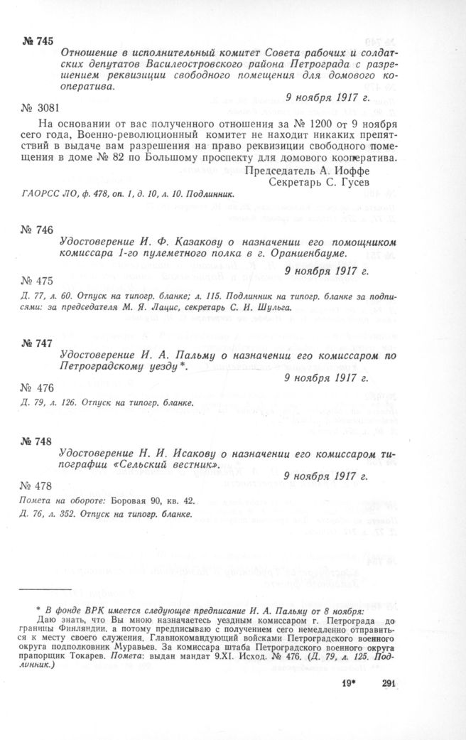 Отношение в исполнительный комитет Совета рабочих и солдатских депутатов Василеостровского района Петрограда с разрешением реквизиции свободного помещения для домового кооператива. 9 ноября 1917 г. // ГАОРСС ЛО, ф. 478, оп. 1, д. 10, л. 10. Подлинник.