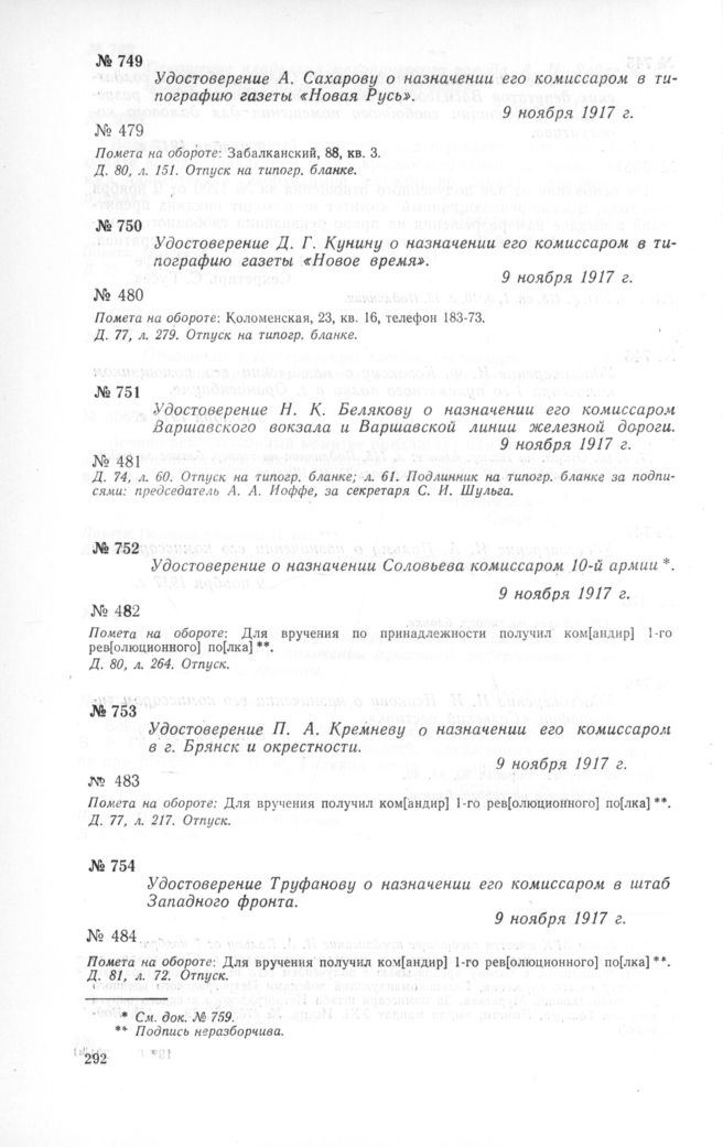 Удостоверение Труфанову о назначении его комиссаром в штаб Западного фронта. 9 ноября 1917 г.