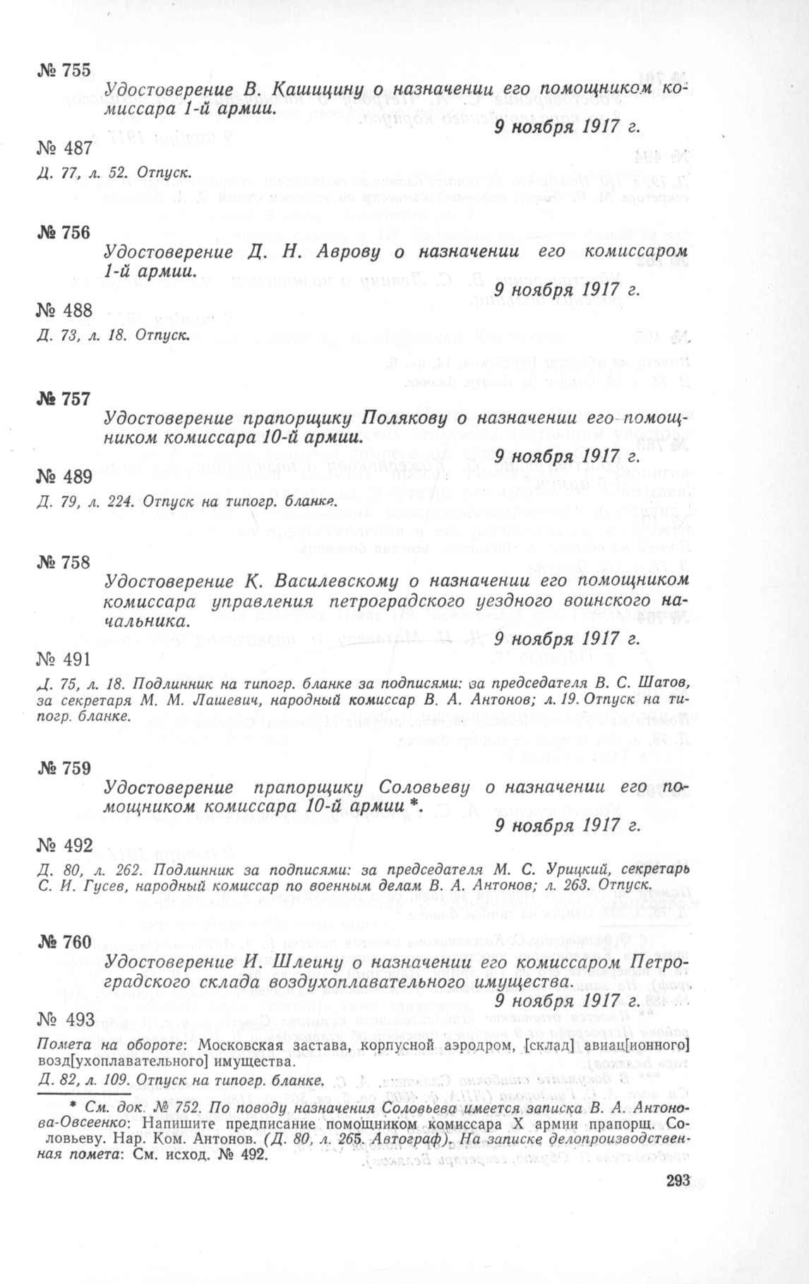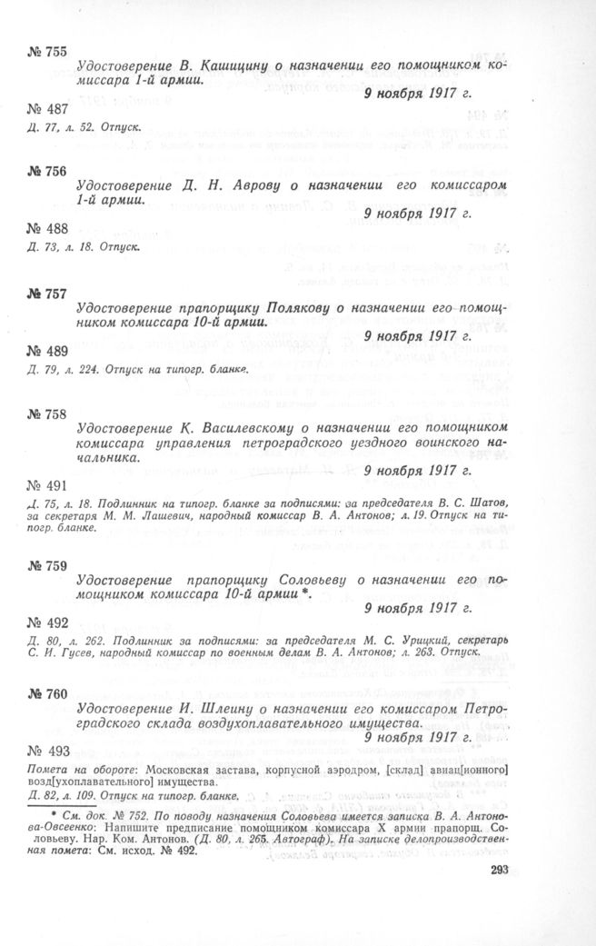 Удостоверение И. Шлеину о назначении его комиссаром Петроградского склада воздухоплавательного имущества. 9 ноября 1917 г. // Д. 82, л. 109. Отпуск на типогр. бланке.