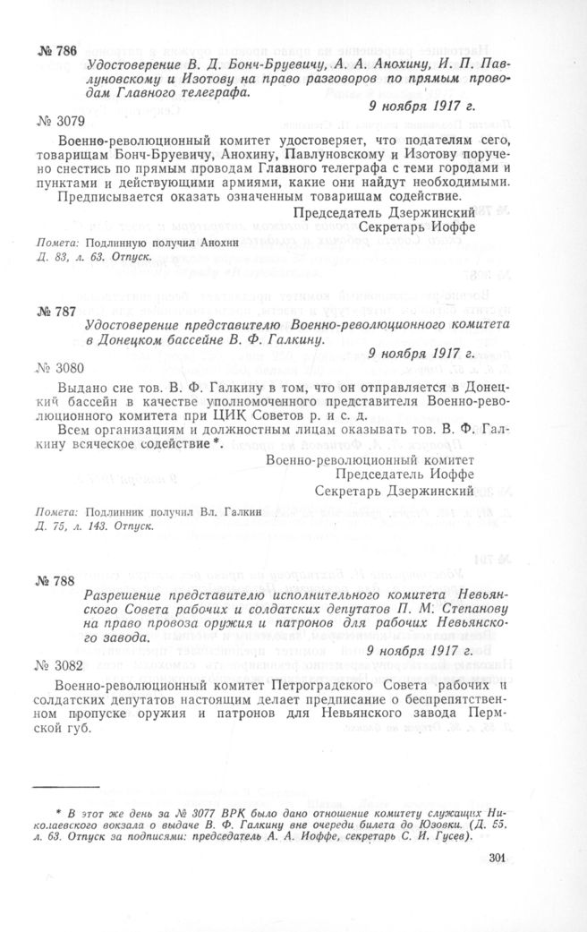 Удостоверение В. Д. Бонч-Бруевичу, А. А. Анохину, И. П. Павлуновскому и Изотову на право разговоров по прямым проводам Главного телеграфа. 9 ноября 1917 г. // Д. 83, л. 63. Отпуск.
